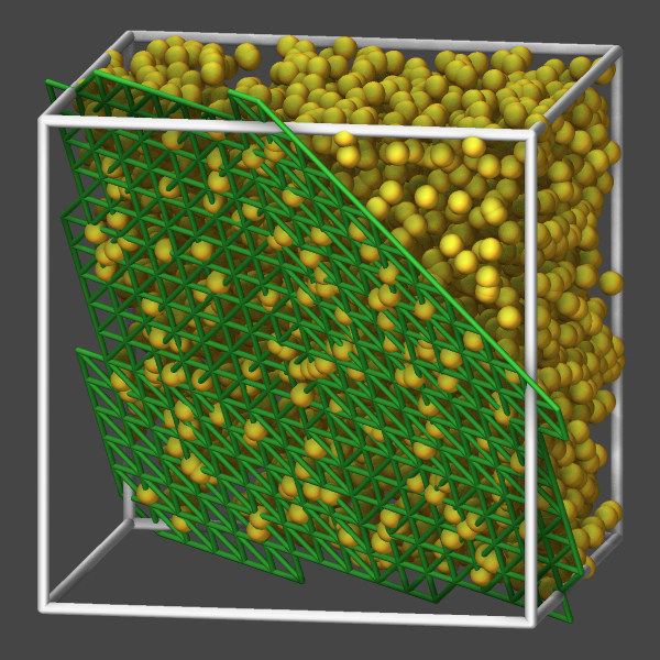 Fix graphics/isosurface adds a triangulated surface following a given isovalue through a 3d-grid of data of some per-atom property. The data is spread out using a Gaussian distribution with a given width and can be just a value of 1 (leading to a grid representing the number density) or mass or some other computed per-atom property from a compute, fix, or atom-style variable. The isosurface can be represented by either a wireframe or a mesh of triangles and there are five choices for the resolution of the grid and thus the smoothness of the surface.